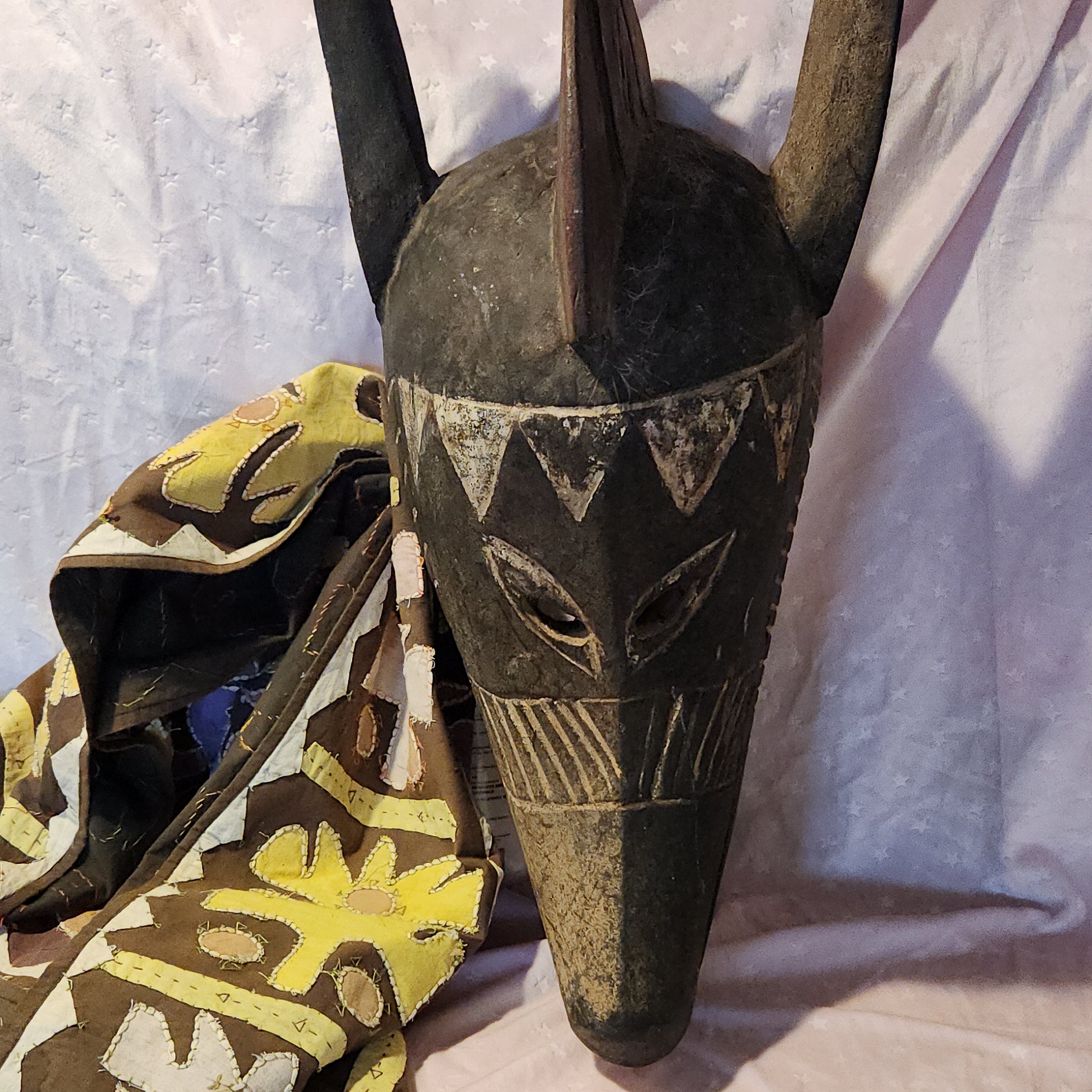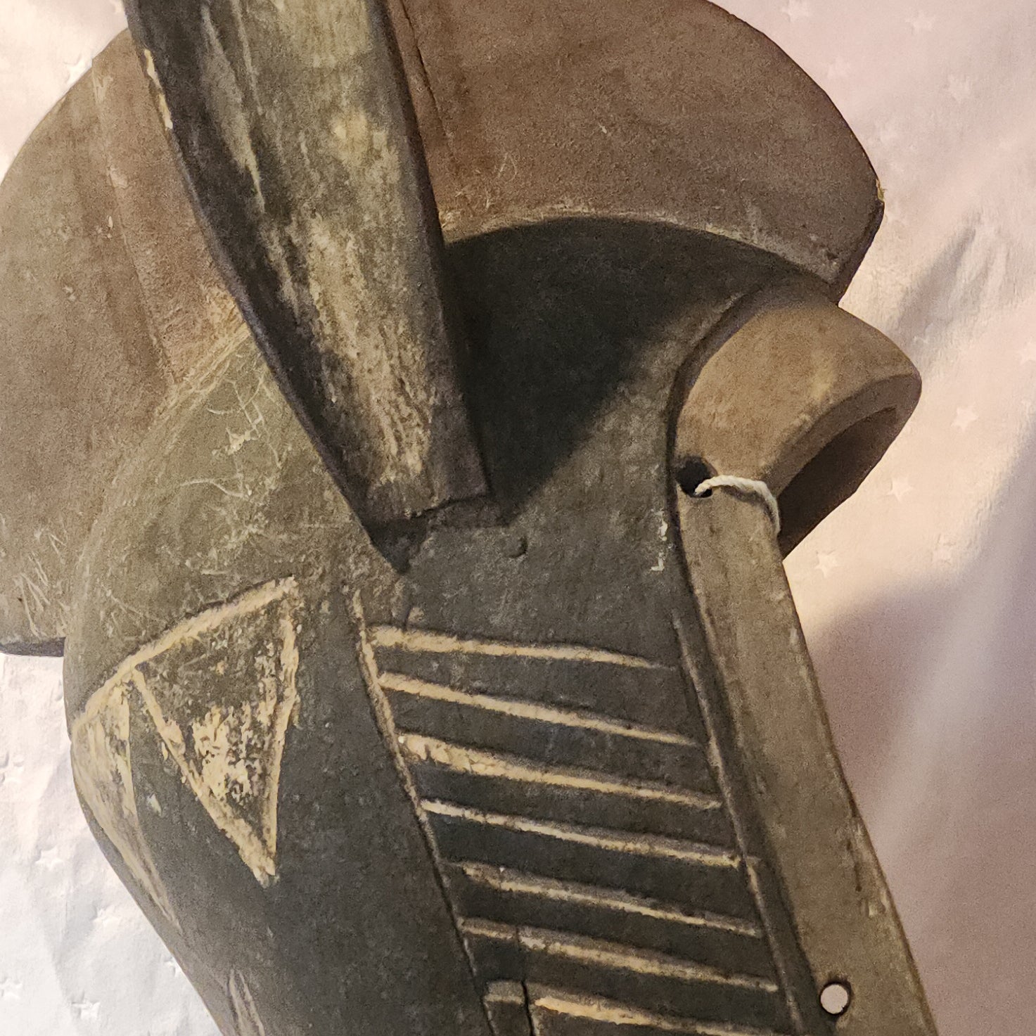 Large hand carved wooden hyena mask from West Africa. White pigment accents.